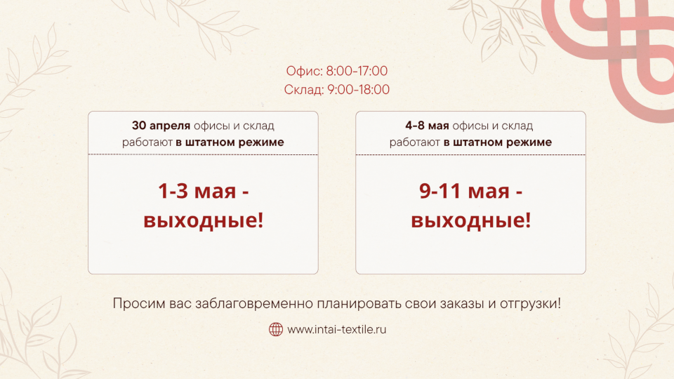 Наш ассортимент насчитывает более 200 разновидностей тканей и всевозможных расцветок с учётом всех потребностей Вашего бизнеса, будь то сезонный спрос или новые тренды в мире моды. Интай-Текстиль – гибкая компания, поэтому мы готовы выполнять индивидуальные поиски и заказы тканей для вас с предоставлением весьма выгодной цены. Мы избавляем вас от множества проблем с растаможиванием и поиском стабильного поставщика – ведь это Интай-Текстиль.